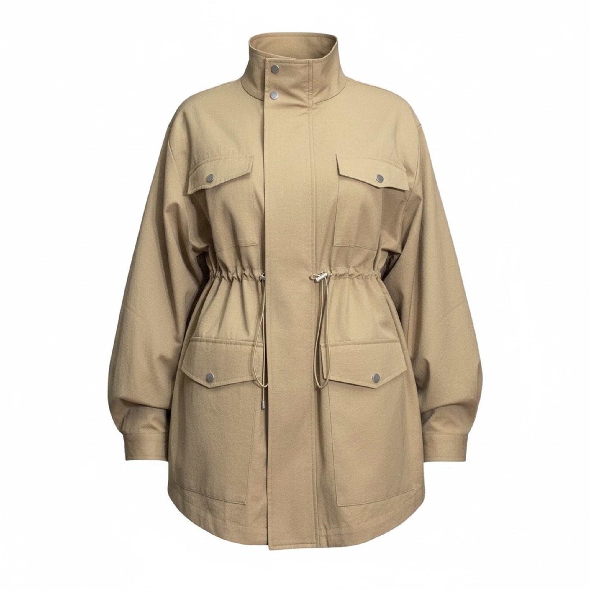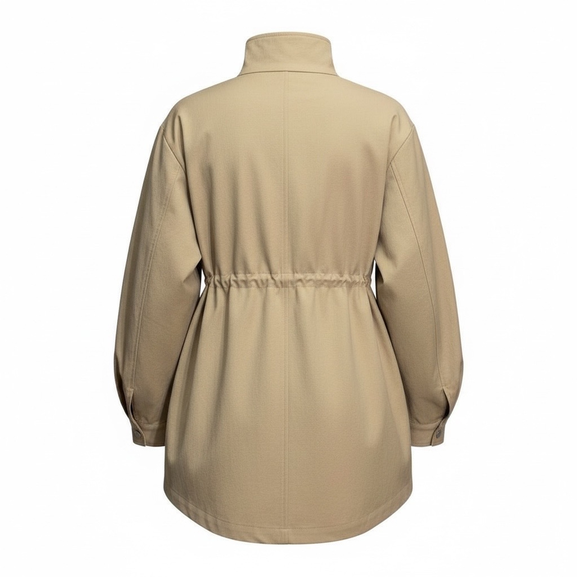 A versatile beige parka designed for both a defined and relaxed silhouette. The adjustable drawstring waist allows the fit to be cinched for a more feminine shape or worn loose for an effortless, oversized look. Featuring a high stand collar, functional flap pockets, and a clean, minimal design, this parka blends practicality with modern elegance. Perfect for everyday wear and easy layering.
